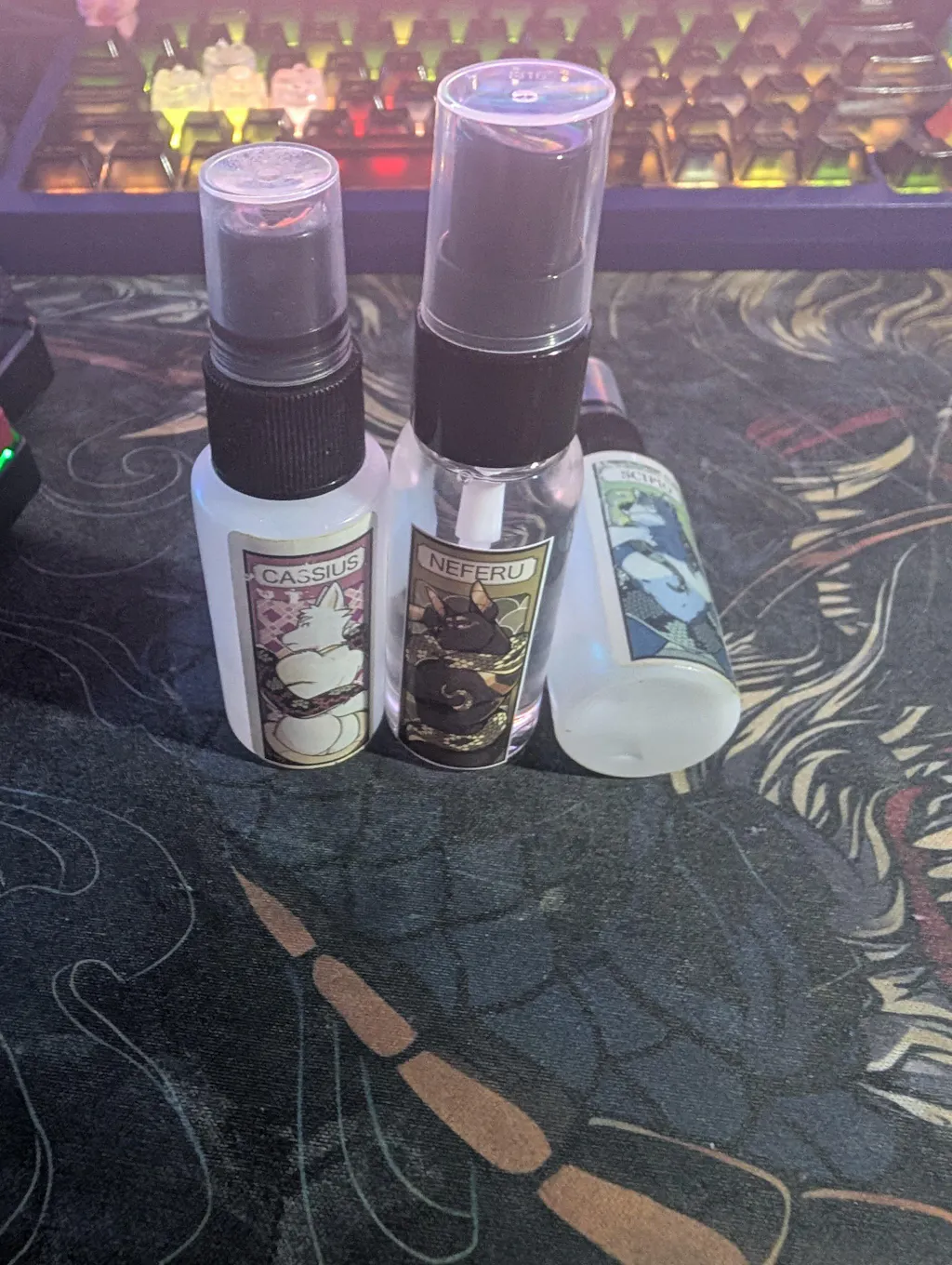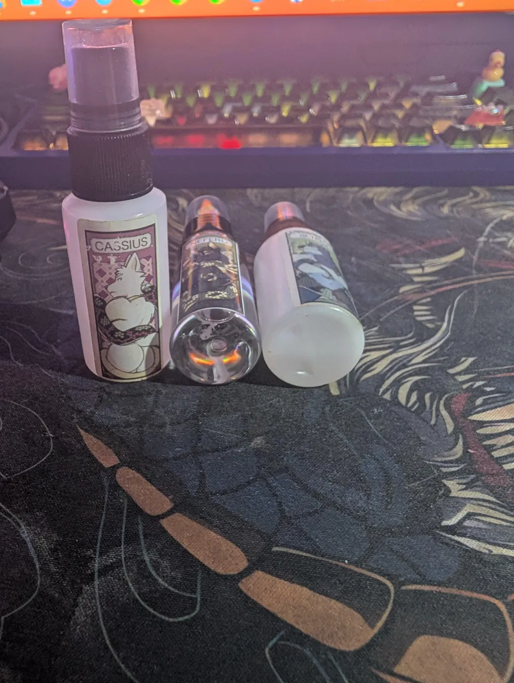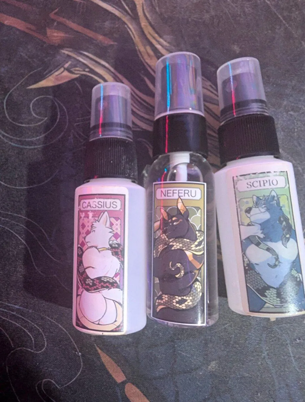 Candles: These candles come in an 8oz metal container with a metal lid. The candles are made of soy wax and are colored based on the chosen character. They use the same recipes as our base perfume scents and can be burned for about 40 hours. Perfect for the dungeon, bedroom, or just general use! They also come with an NSFW sticker!